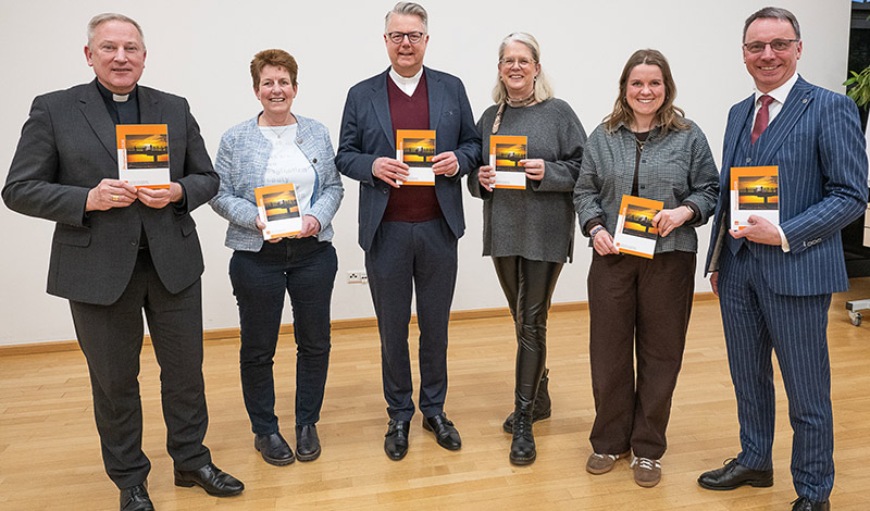 Übergabe des neuen Jahresprogramms an den Pastoralrat für die Katholische Kirche im Oldenburger Land: v. l. Weihbischof Wilfried Theising (BMO), Petra Focke und Pfarrer Dr. Marc Röbel (Fachstelle), Mareike Rozijn (Moderatorin Pastoralrat), Alina Lübbers (Fachstelle), Dr. Markus Wonka (BMO)